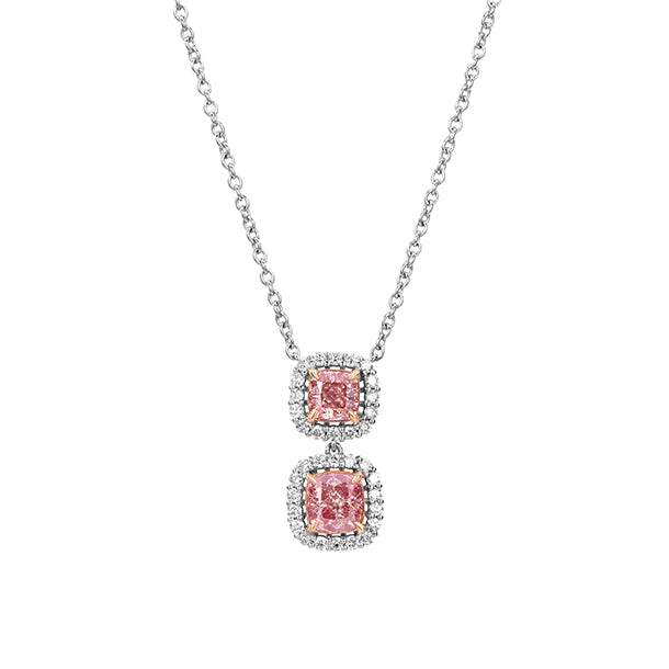 Delicate and graceful, this pendant features two cushion cut pink diamonds: an approx 0.76 carat...