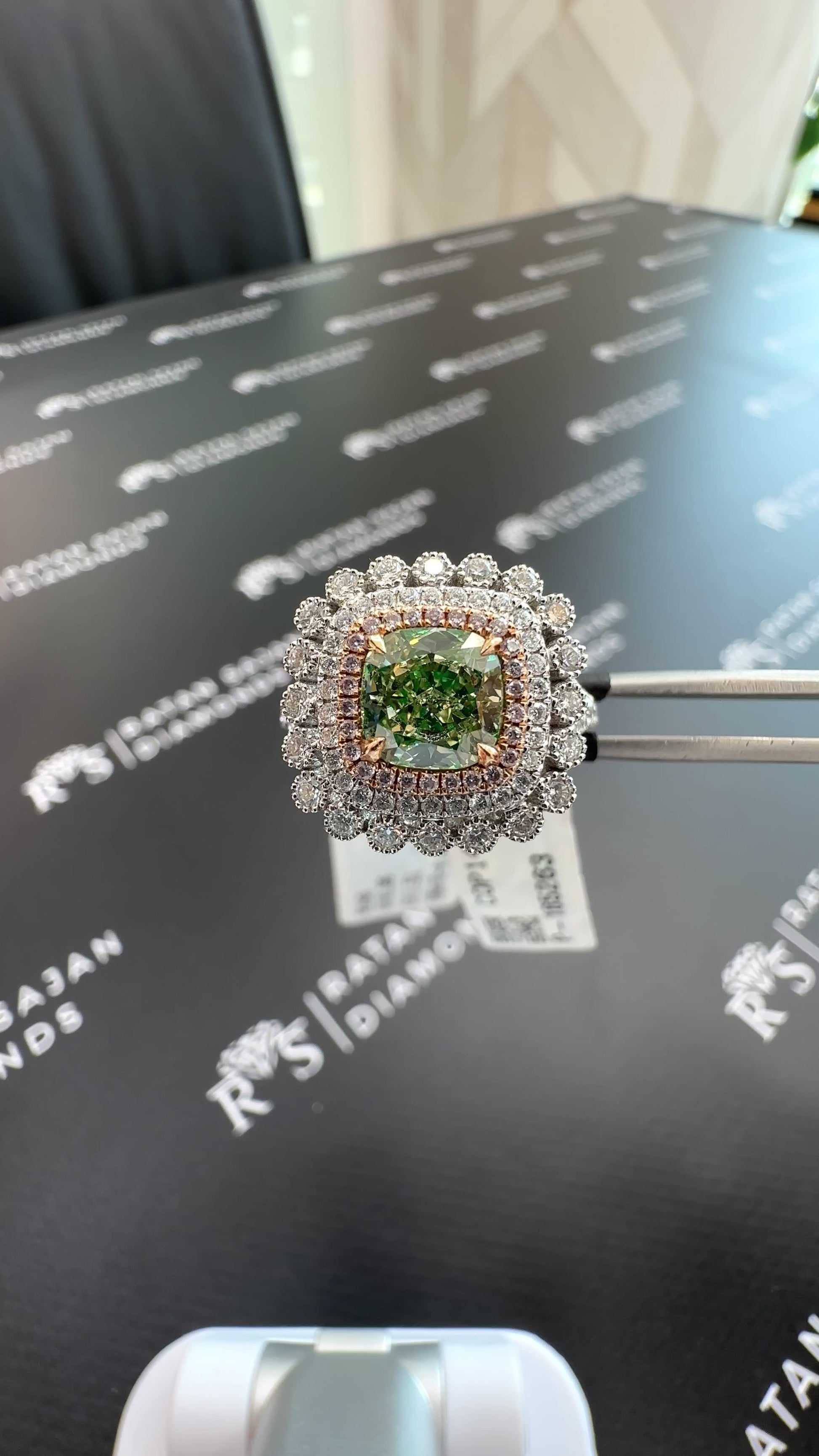 The cushion cut enhances the diamond’s brilliance and depth, while the VS2 Clarity ensures a clean, radiant sparkle. The soft contrast between the vibrant green center diamond and the romantic pink side diamonds creates a truly luxurious and sophisticated design.