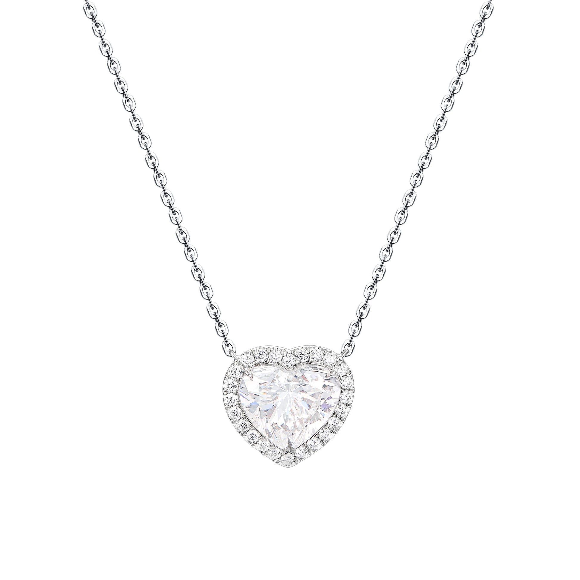 Romantic and timeless, this pendant features an approx 3 carat heart shape diamond, E color, SI1 clarity, GIA certified. The exceptional cut and near-colorless grade offer brilliant sparkle with a soft, elegant silhouette.
