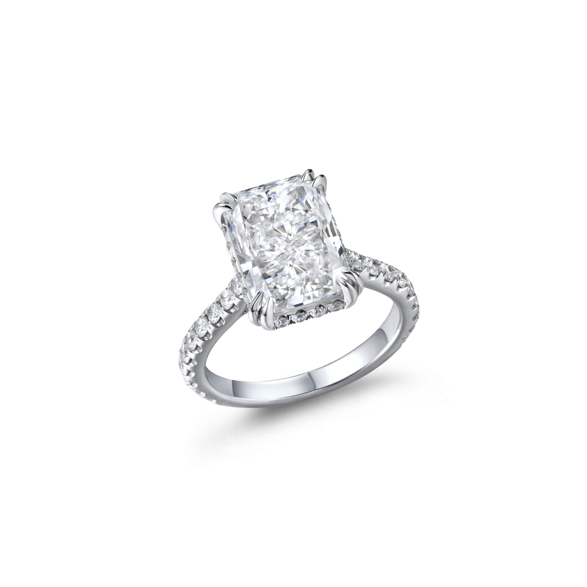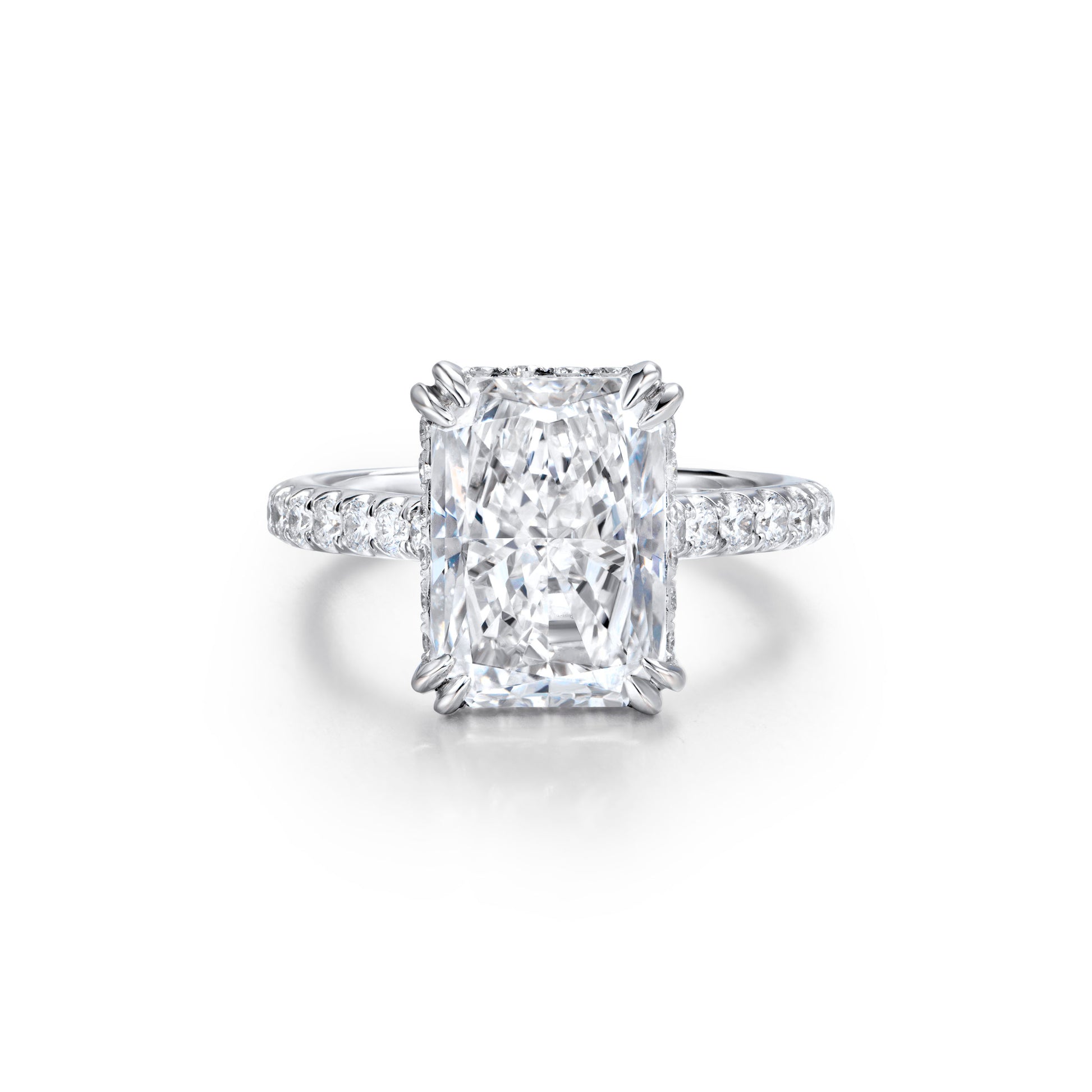 Modern and bold, this ring features an approx 5.03 carat radiant cut diamond, G color, SI2 clarity, GIA certified. Accented with approx 0.81 carats of melee diamonds, the setting enhances the brilliance and clean lines of the center stone.