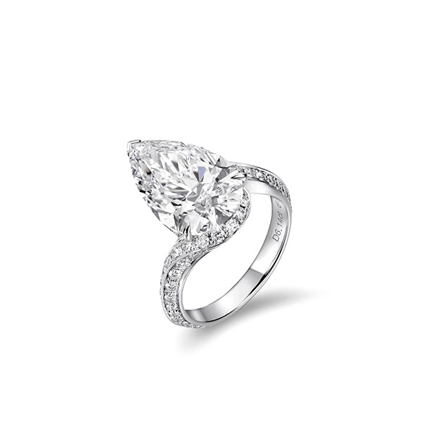 Elegant with a contemporary twist, this ring features an approx 6 carat pear shape diamond, D color, SI2 clarity, GIA certified. The graceful silhouette is enhanced by a sculptural twisted band design, adding a modern edge to a timeless shape.