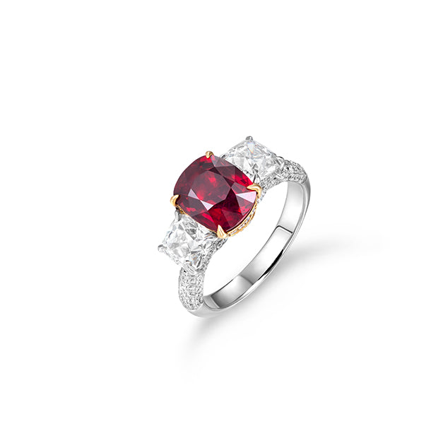 A vivid expression of timeless beauty, this ring showcases an approx 3.06 carat Mozambique ruby, certified by GRS for its exceptional color and origin. The rich red center stone is flanked by two antique-inspired old mine cut cushion diamonds, with an approx total weight of 1.68 carats, adding character and brilliance.